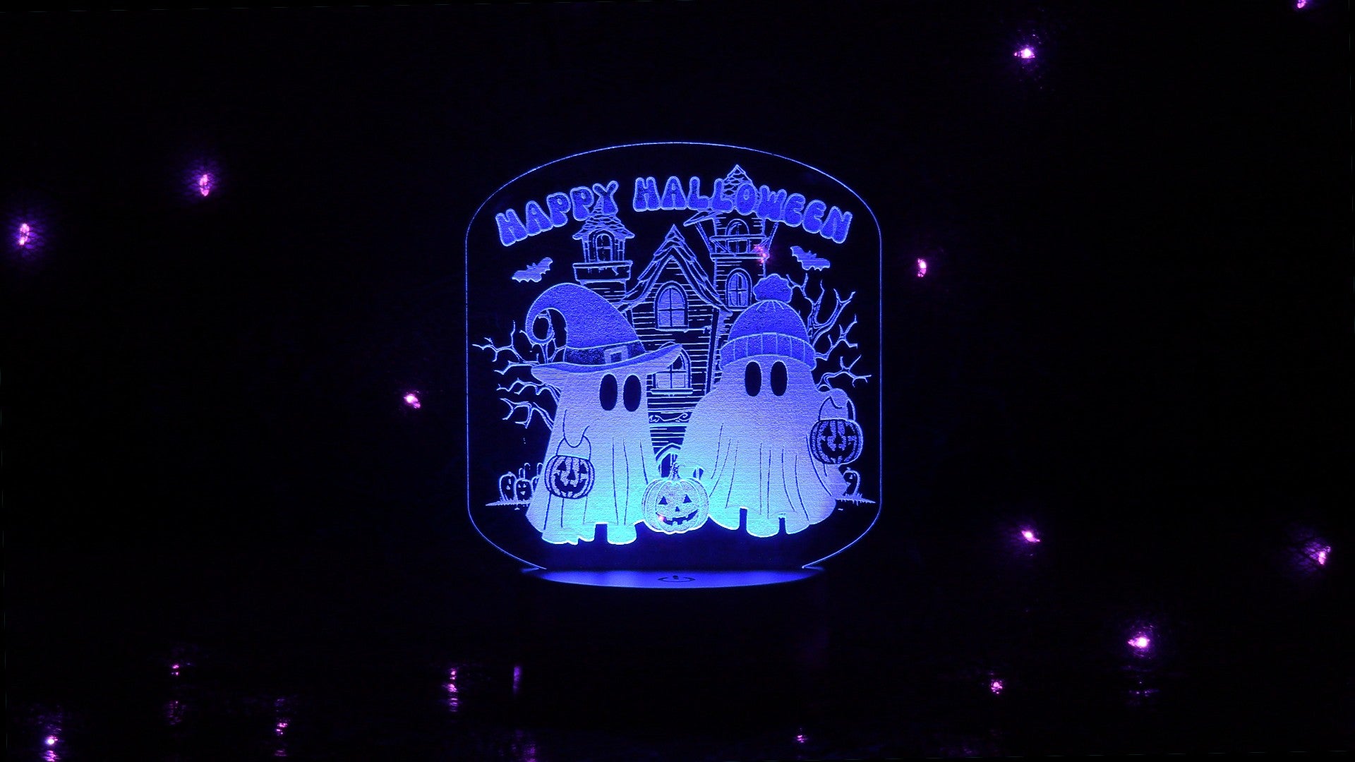 Brighten your Halloween decor with this adorable LED lit sign. It can be lit steady in your choice of 16 colors and level of brightness, and has 4 different color change modes. All of this is controlled by the included handy remote. It can be powered with an included micro-USB cord, or with 3 "AA" batteries. Batteries not included.
