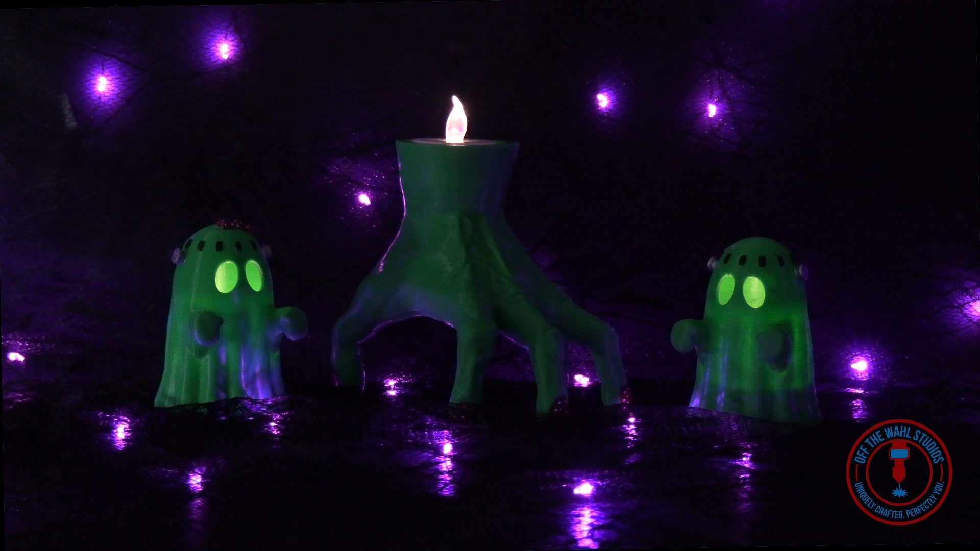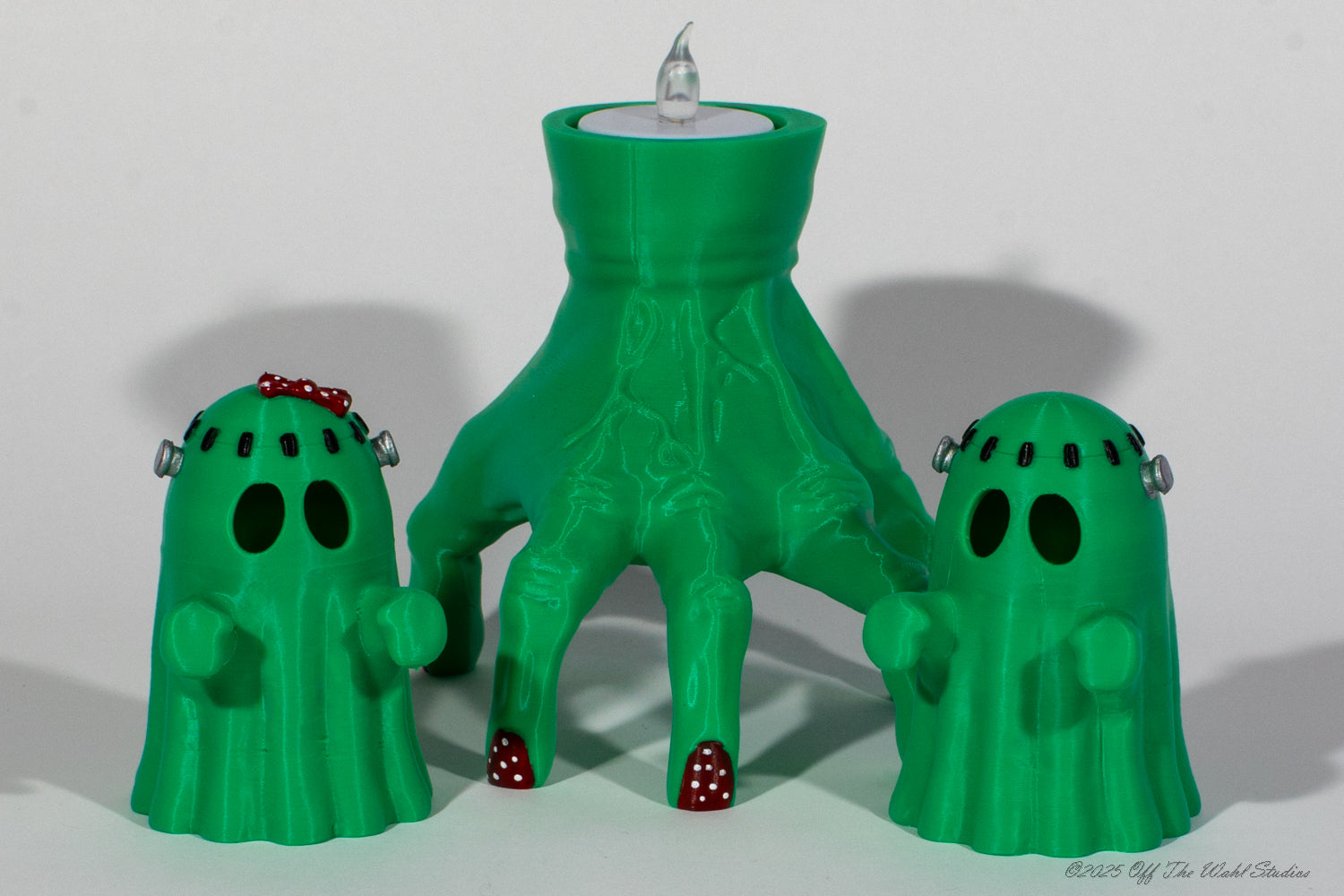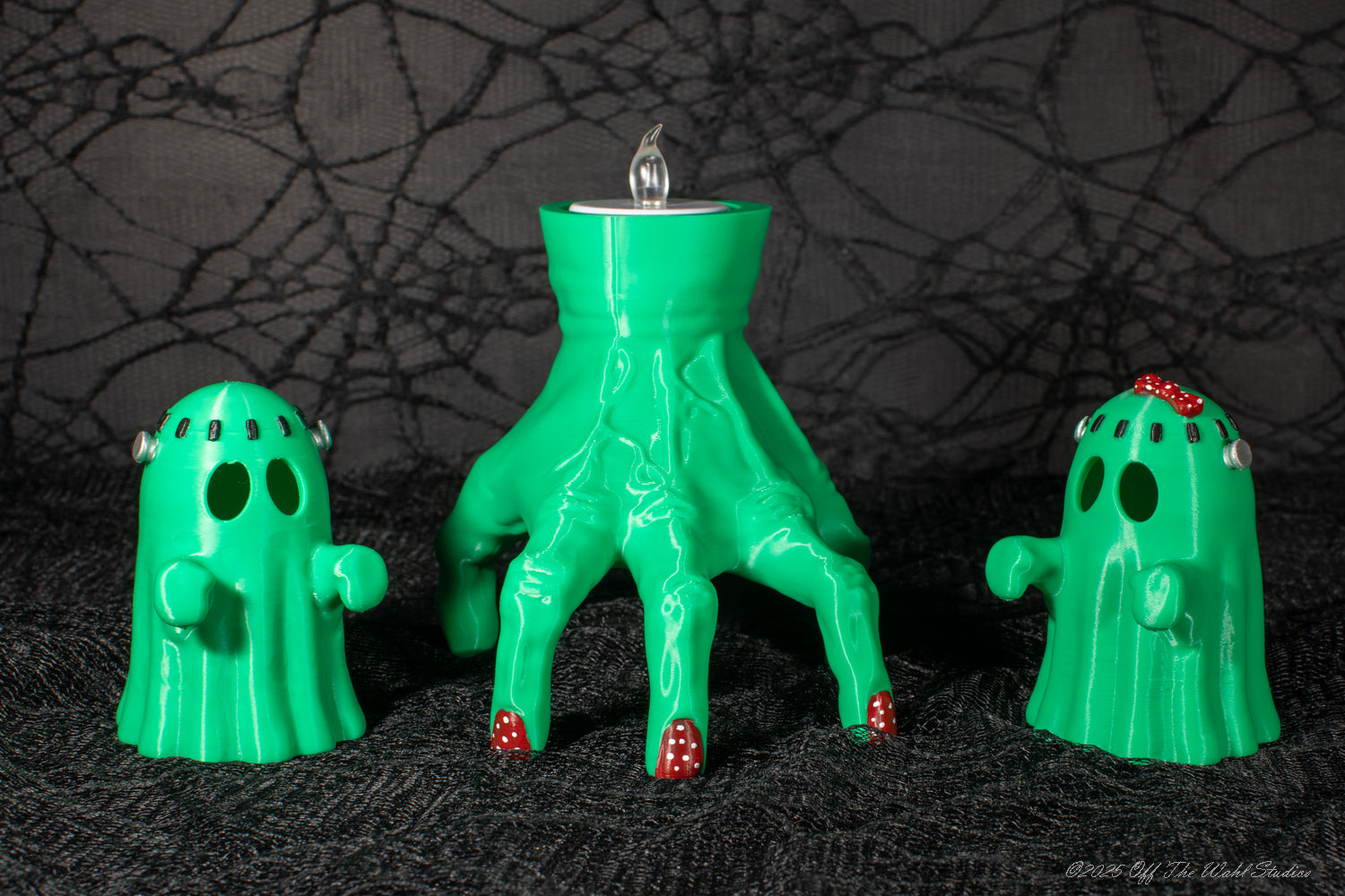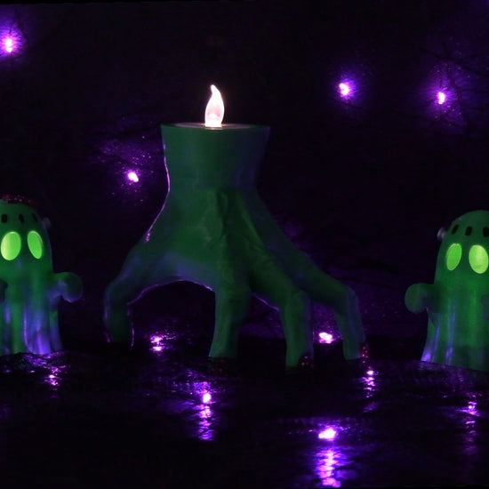 These cute little ghost luminaries come with the two ghost luminaries and The Hand. All three include a battery operated tea light. They stand 3" - 4" tall with hand painted details to brighten your Halloween season.
